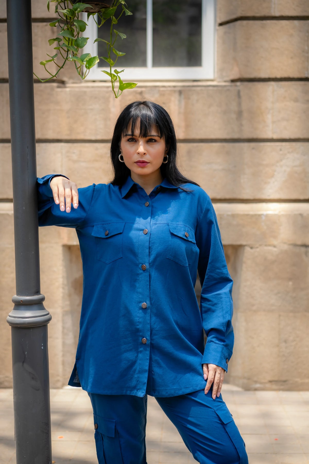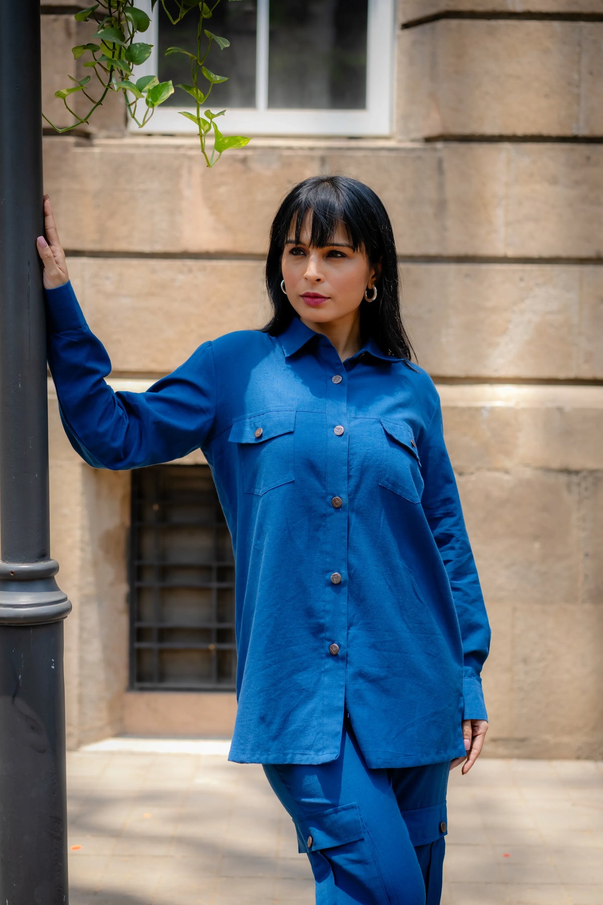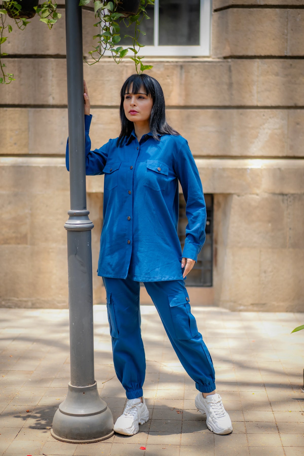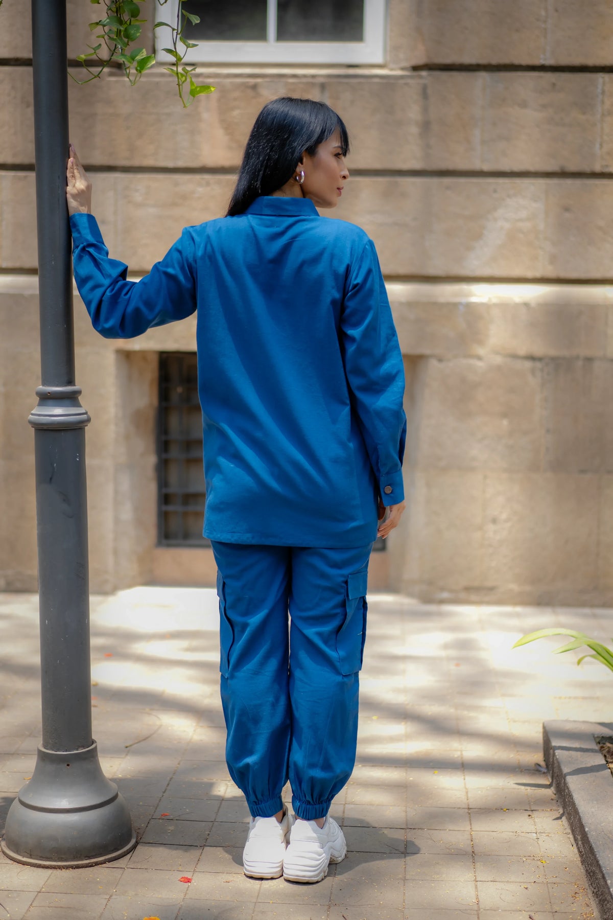 Meet our versatile Denim Blue Cotton Set, designed for all-day comfort and style. The set includes an asymmetric shirt and joggers, both crafted from soft cotton flex fabric. The shirt stands out with its intriguing asymmetric placket, which forms a unique pleated panel on the left side, adding a contemporary touch to the classic design."