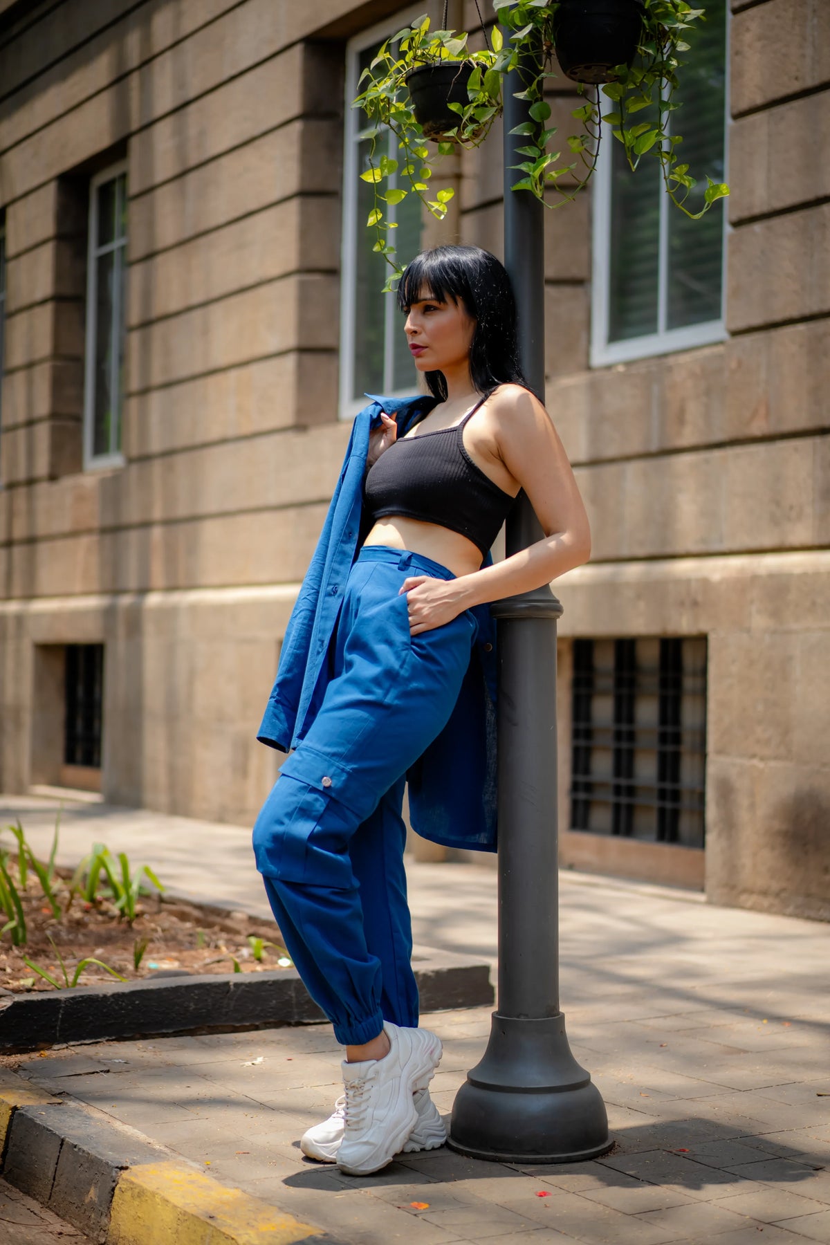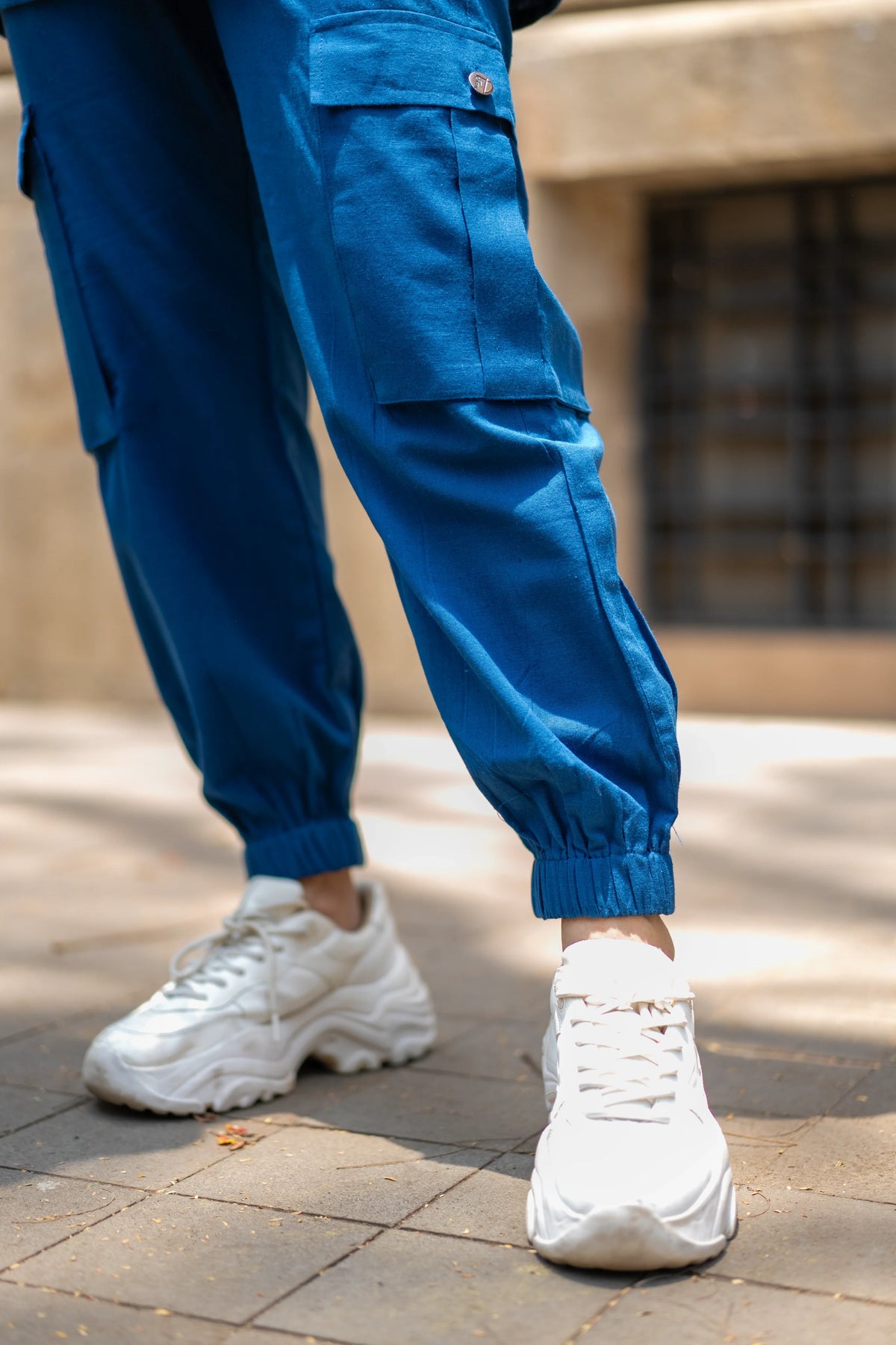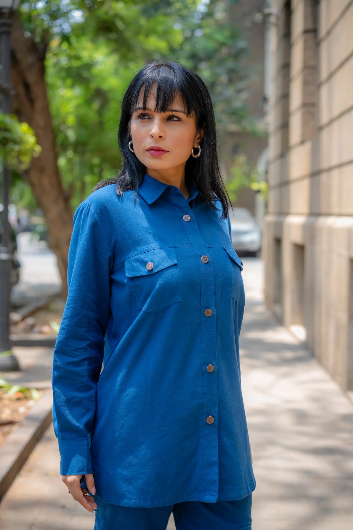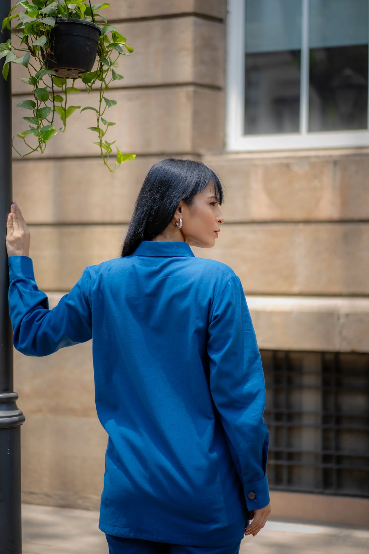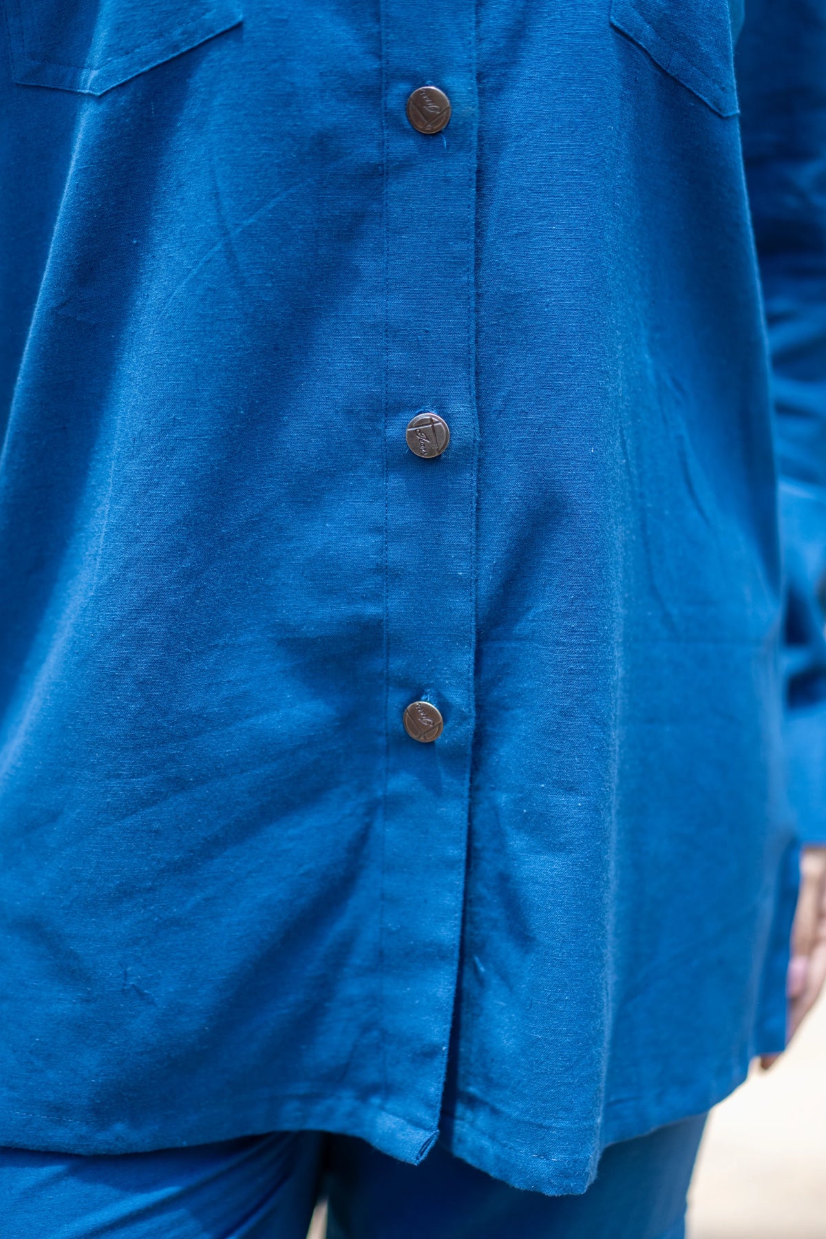 Meet our versatile Denim Blue Cotton Set, designed for all-day comfort and style. The set includes an asymmetric shirt and joggers, both crafted from soft cotton flex fabric. The shirt stands out with its intriguing asymmetric placket, which forms a unique pleated panel on the left side, adding a contemporary touch to the classic design."